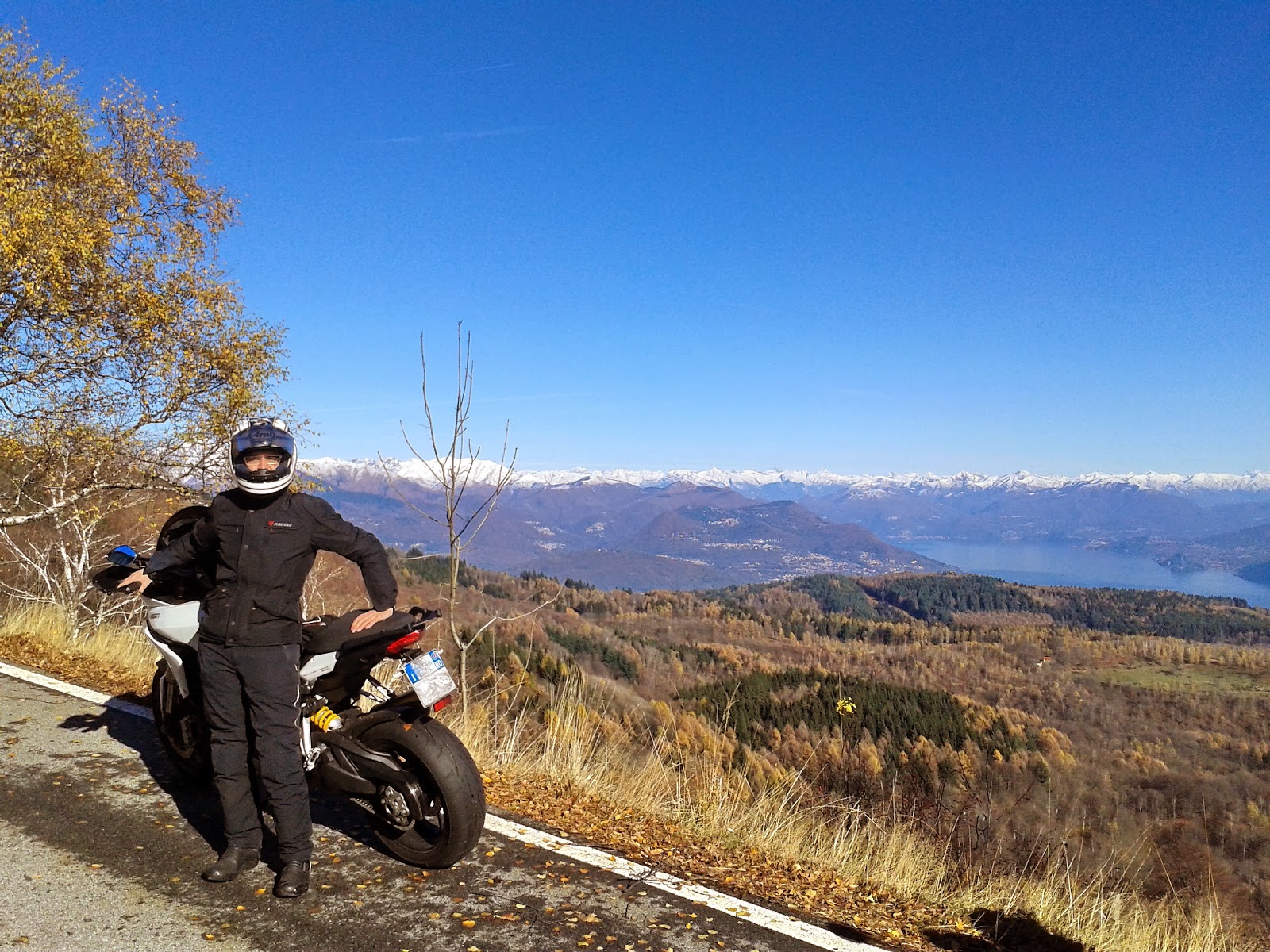 Ci godiamo il sole in faccia e prendiamo anche un bel colorito... solo la voglia di goderci la moto con questo meteo perfetto ci convince a schiodare dalla terrazza immersa nel sole.. insieme ad un amico di Peo con una Street Triple incontrato in cima riprendiamo la discesa, per poi seguire la strada di Gignese: siamo diretti verso Stresa, sul Lago Maggiore. Sempre attenzione, per via dei tratti in ombra e delle foglie marce.. giunti sul lungolago, ci godiamo i bellissimi paesi che costellano il lago, pieni di gente che passeggia e si gode questo clima benevolo.