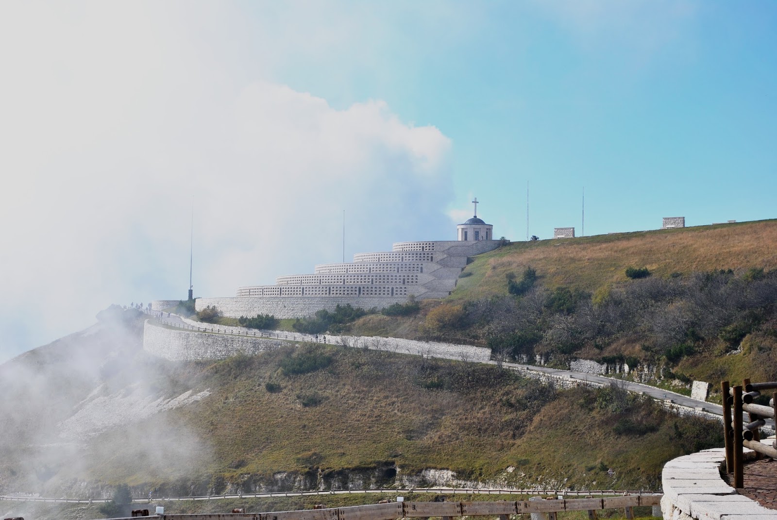 La strada ha un bel fondo, anche se occasionalmente si accumulano gli aghi di pino che invitano a scegliere traiettorie più tranquille. Man mano che si sale, entriamo anche in qualche nuvola. Arrivando in quota, la vegetazione si dirada per lasciare spazio ai prati. La strada diventa più sporchina per l'umidità e per dei riporti di fango dovuti anche al passaggio di animali da pascolo. Arriviamo in cima al Grappa e non può non suscitare emozione l'imponente Sacrario ai caduti della Grande Guerra.