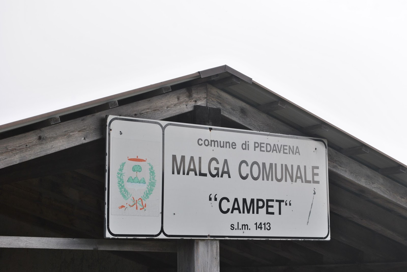 Guardando in alto, le nuvole coprono il Croce d'Aune. Ma decidiamo di salire lo stesso. Sarà una salita di una decina di minuti, ma il tracciato è bellissimo e questa volta non troviamo traffico di sorta: saliamo a meraviglia, con curve, pieghe, tornanti fino in cima al passo. Poi decidiamo di anticipare l'ora del pranzo: per arrivare a Malga Campet c'è un bel tratto di sterrato. Fantastico!