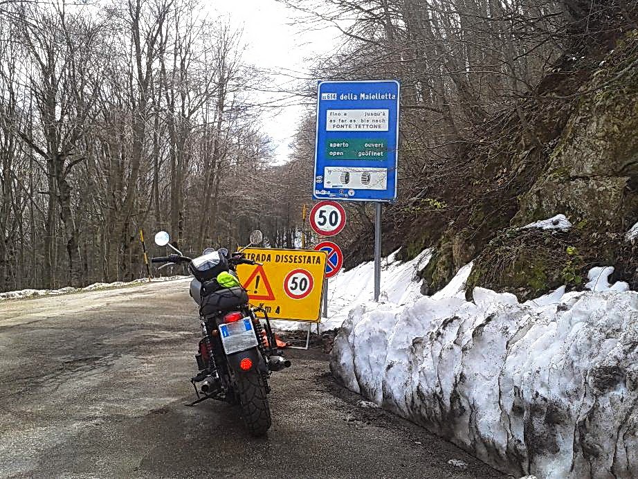Provo a spingermi più su, verso i 1.900 m del rifugio Pomilio, ma la strada, poco più avanti, è chiusa al traffico e coperta dalla neve.