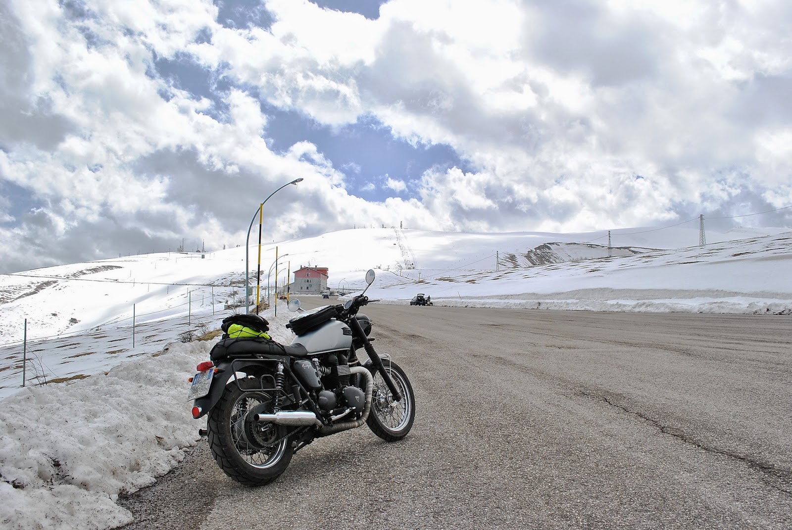 Un paio di km prima della sommità la parte dissestata finisce e si può tornare a godersi ancora qualche curva, fino all'ultimo tornante a sinistra, che apre la vista della spianata della Majelletta, a circa 1600 m. sul livello del mare. Ma quanta neve c'è? Ecco la vista dell'Albergo Mamma Rosa..