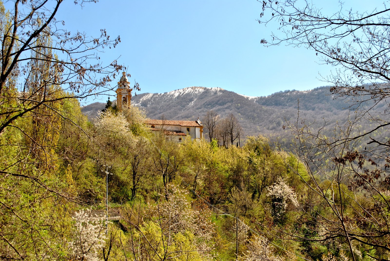 La strada si inerpica tra gli alberi, ancora abbastanza spogli, e il sottobosco è coperto dalla neve.
