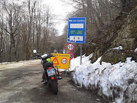 ..la salita è bella curvosa, ma il fondo stradale torna ad essere bagnato e, man mano che si sale, tende ad essere abbastanza deteriorato. Ecco la Randagia sulla sommità. Siamo proprio al confine tra le province di Parma e la Spezia e il valico segna anche lo spartiacque tra Emilia e Liguria.