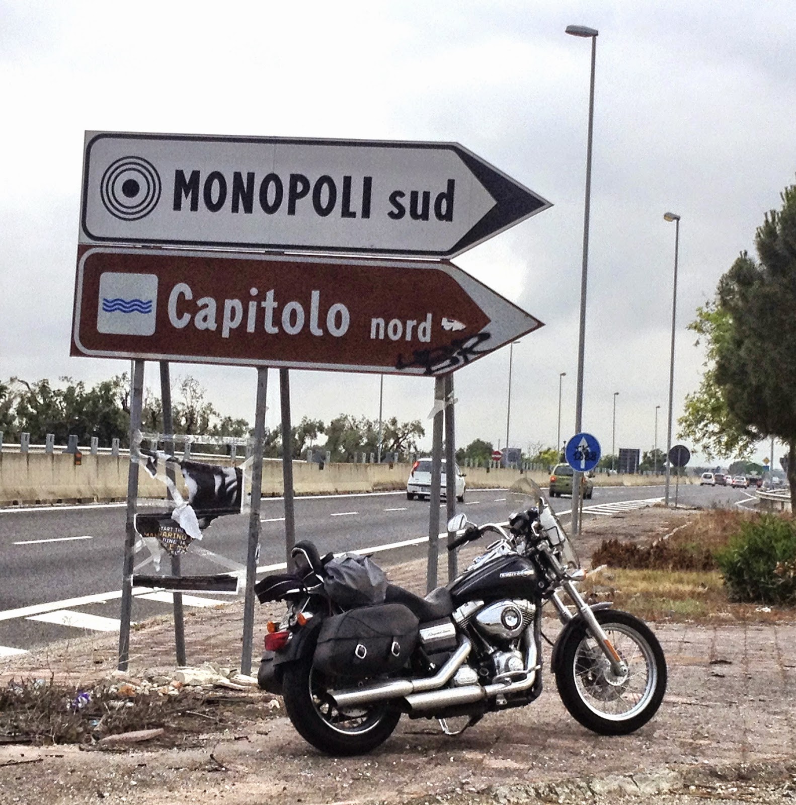 Risaliamo verso Gallipoli passando appena all'interno della costa, lasciandoci alle spalle Gallipoli (non con qualche difficoltà di orientamento dovuta a cartelli stradali disposti un po' a caso), Nardò, Avetrana. Qui sostiamo per un piccolo lavoretto di sistemazione dei cavi elettrici che corrono all'interno del parafango posteriore. Nessuno13 li fissa meglio, in modo che non penzolino. Fa molto caldo. Proseguiamo per Manduria e quindi giungiamo a Taranto, seguendo le indicazioni per la SS106 Ionica. Impossibile non vedere dal ponte che passa sulla baia l'immensa struttura industriale dell'Italsider: con la sua sagoma color rosso ruggine domina il panorama.