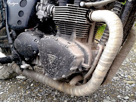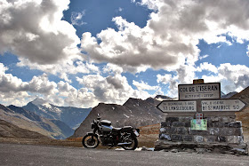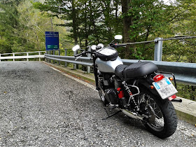 All'inizio la strada è asfaltata, con qualche tornante. Il fondo stradale è però infido per via della ghiaietta e dell'acqua. Dopo un po' però la strada diventa strerrata, piena di sconnessioni, tagli trasversali e buche, ricolme di acqua. Nessuna segnalazione in merito: se avessimo avuto altre moto, probabilmente sarebbe stato un grosso problema. La nebbia incombe sulla montagna e limita la visibilità a pochissimi metri. Il faro anteriore della Bonneville è soprannominato "prince of darkness" per qualche motivo..