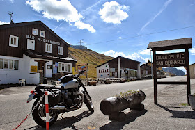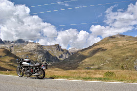 Procedo nella nebbia, prestando la massima attenzione. La Bonneville non è propriamente una motocicletta da off road... Giai è rimasto un po' indietro perchè si è fermato ad indossare l'abbigliamento antipioggia.. Passato il Giogo dela bala a 2.136 m., scendiamo verso il passo Crocedomini, a 1.895 m.