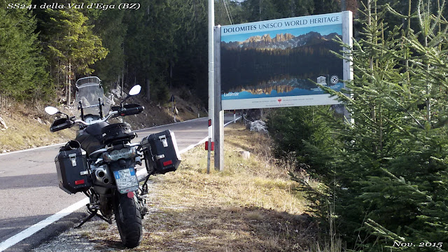Scendo verso Bolzano, attraverso rapidamente le sue ampie strade. Seguo le indicazioni per la Eggtal (in italiano la Val d'Ega). Faccio benzina al grande distributore della Esso sulla sinistra, poco prima della deviazione per la SS241 della Val d'Ega a destra. Si sale verso Ponte Nova e cominciano a stagliarsi i profili delle Dolomiti.