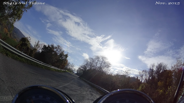 Poi seguo la statale fino a Lovere e Darfo. Questo tratto di strada è dritto e monotono e la nebbia non ravviva certo l'interesse. Finalmente la bianca coltre si squarcia e le montagne cominciano a stagliarsi contro il cielo. La strada comincia a diventare interessante già prima di arrivare a Edolo, là dove c'è la deviazione per il Passo del Vivione.