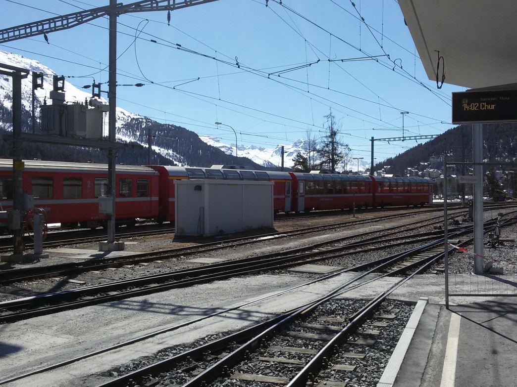 D'accordo il contesto suggestivo, ma basta scattare la foto senza guanti per congelarsi le mani. Quindi una foto e si ridiscende verso St. Moritz. Approfitto per scattare una foto al celebre trenino rosso, fermo in stazione.