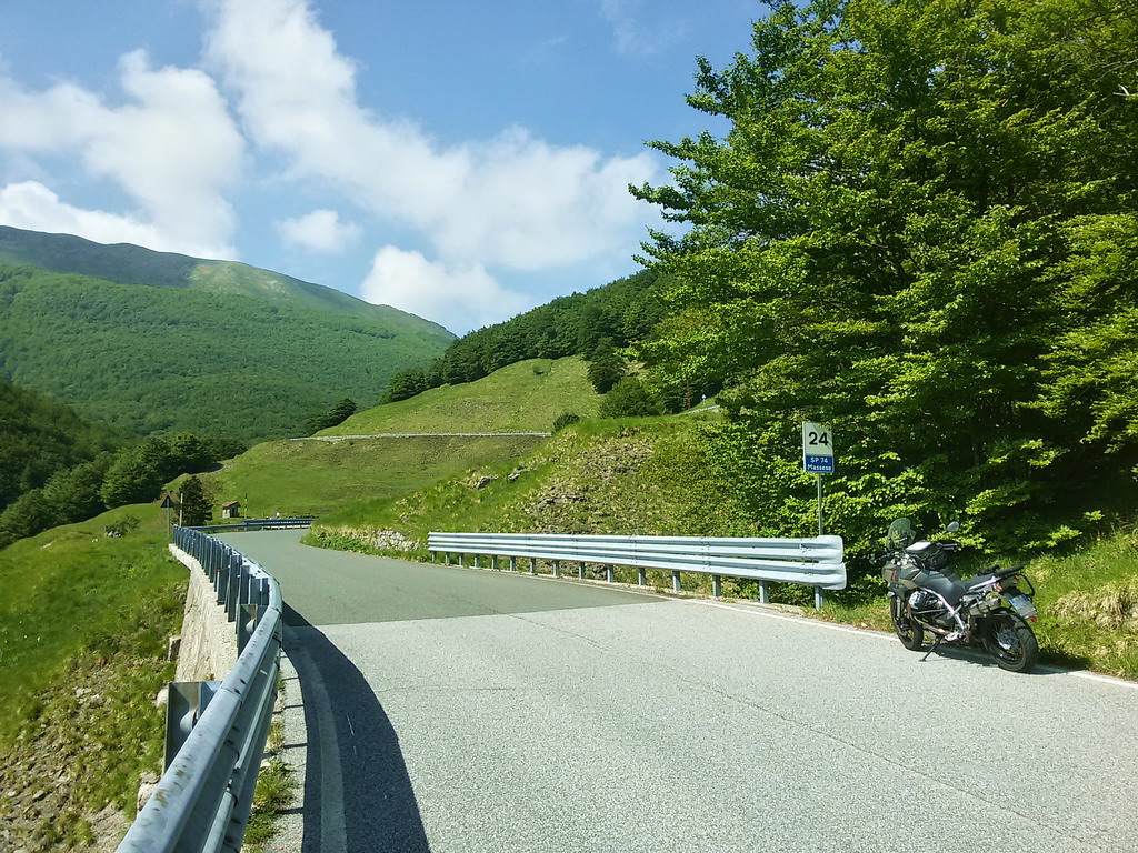La strada, la SP74 Massese, prima è un falsopiano guidabilissimo, poi sale verso sinistra e per il passo. E' bellissima, veloce, curvosa, da terza piena e quarta. Il motore della Stelvio suona "pieno" e potente. Uno spasso! Anche il panorama, con i monti ricoperti dai boschi, è molto suggestivo.