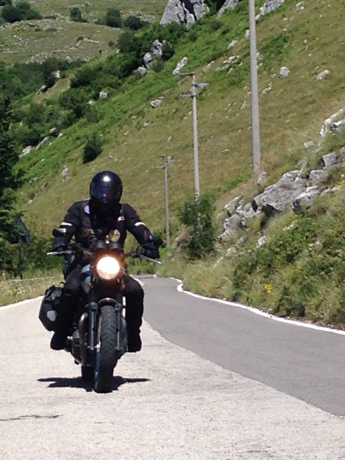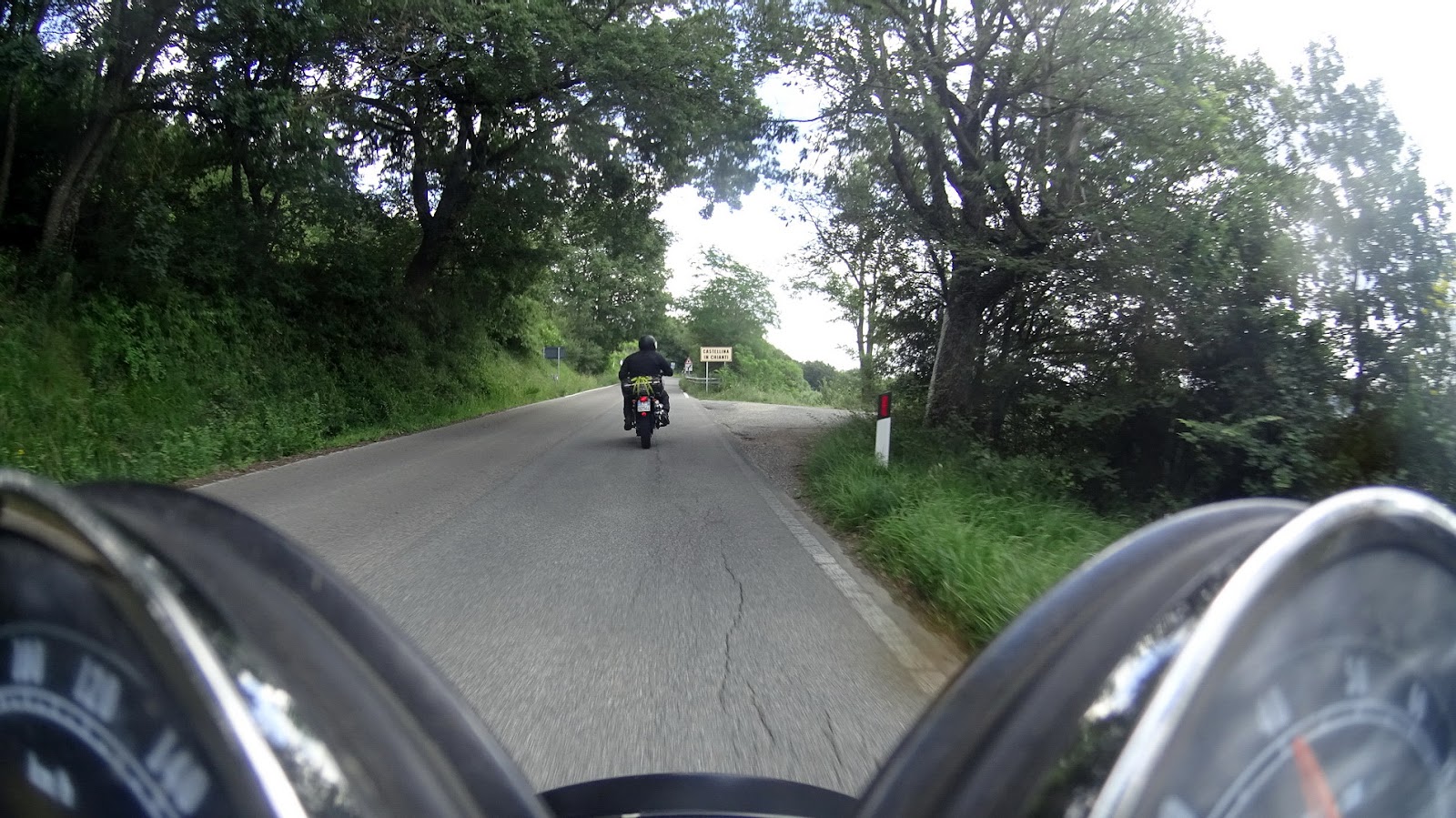 Finalmente la salita inizia e inizia una serie di curve consecutive impressionante, senza soluzione, che permettono di piegare tantissimo, ma non danno modo di aprire violentemente il gas e prendere velocità: il divertimento sta nel girare a velocità anche contenuta, ma con marce basse e motore in coppia, sempre pronto a scalate e ripartenze. Ci scappa anche una sonora grattata alla pedana. Traffico zero, ma ci manteniamo nelle regole del C.d.S. dal momento che ne abbiamo sentite tante sugli agguati delle forze dell'ordine su questo tratto molto frequentato dai motociclisti nel fine settimana. Una volta arrivati in cima ci guardiamo e commentiamo soddisfatti questa salita che sembrava non finisse mai!
