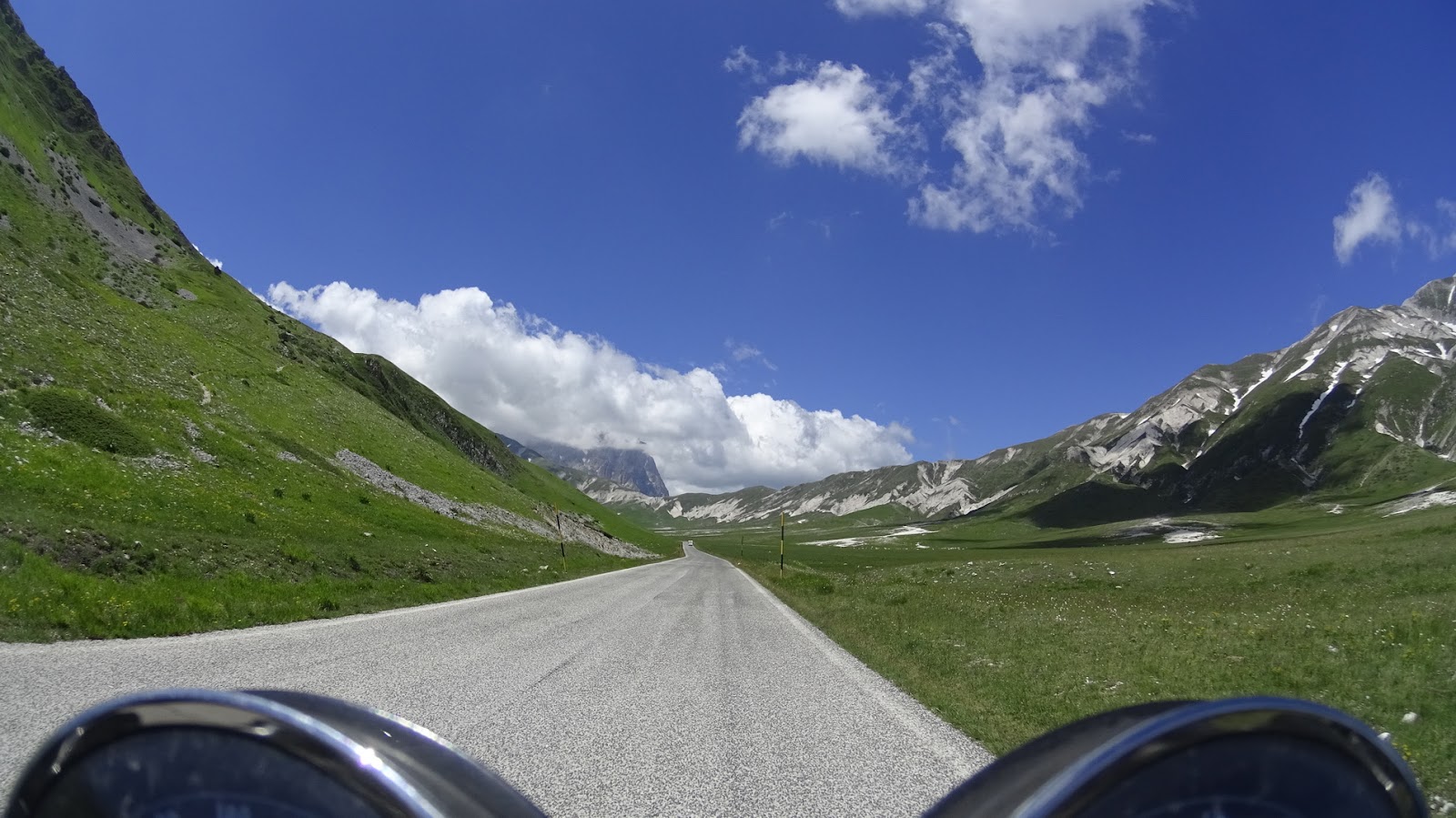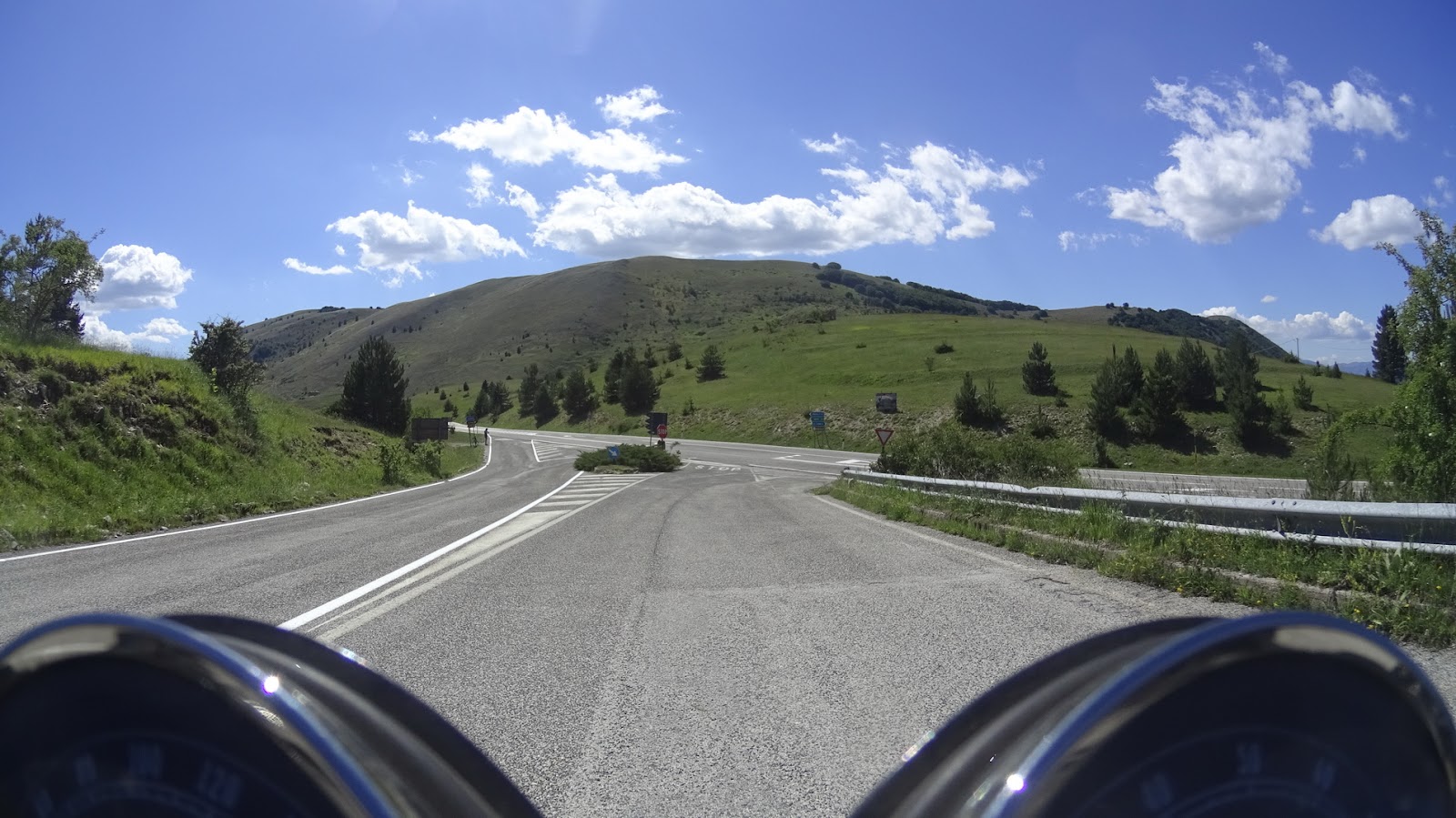 Giungiamo al piccolo paese di Castel del Monte, con la sua torre campanaria ancora in via di restauro dopo il terremoto del 2009. Da qui, voltando a sinistra e poi a destra (nessun problema: le indicazioni sono ben presenti) si sale con altri bei tornanti e un gran fondo stradale verso il Valico di Capo la Serra. Già prima di arrivarci la vegetazione è rarefatta e i pianori al lato della strada sono punteggiati di massi dal colore grigio. Cominciano inoltre a stagliarsi contro il cielo azzurro e terso alcune cime. Dal valico inizia un tratto di discesa abbastanza guidato, dove è bene non lasciarsi prendere la mano: alcune curve sono un po' improvvise e con un raggio irregolare, magari seguite subito da un'altra molto ristretta. Dopo questo breve tratto, si apre finalmente in modo spettacolare la vista sull'altopiano di Fonte Vetica. Impossibile non rimanere estasiati.
