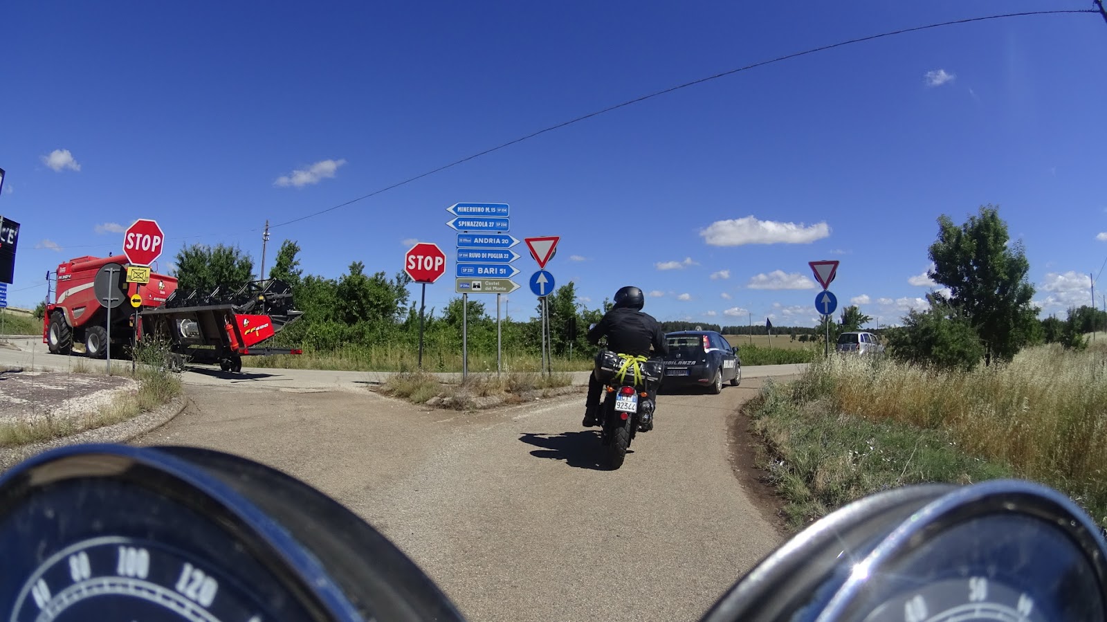 Da Gravina ci siamo subito diretti verso l'Altopiano dell'Alta Murgia: l'altopiano si staglia al di sopra della pianura. Subito il panorama diventa estremamente caratteristico. La fanno da padroni i colori caldi, gialli, ocra. Anche le strade hanno il colore della terra rossa. E poi i campi di zolle scure; i muretti a secco; gli ulivi (quest'anno gravemente minacciati dalla Xylella, che sta mettendo a rischio l'intera economia agricola olearia di questa bellissima terra). Prime curve per salire sul pianoro e poi diversi km sulla strada che collega Gravina a Corato, la SP238. In lontananza si incomincia a vedere il mare Adriatico. Traffico molto limitato e lunghi rettilinei con la strada che, di tanto in tanto, segue la discesa di qualche avvallamento per poi riportarsi in piano. Anche questo contribuisce a rendere la guida tutt'altro che noiosa, contrariamente a quanto si potrebbe essere portati a pensare.