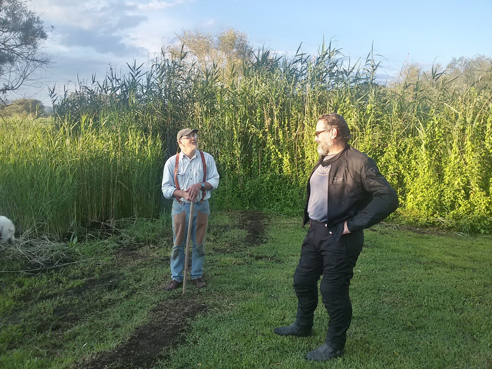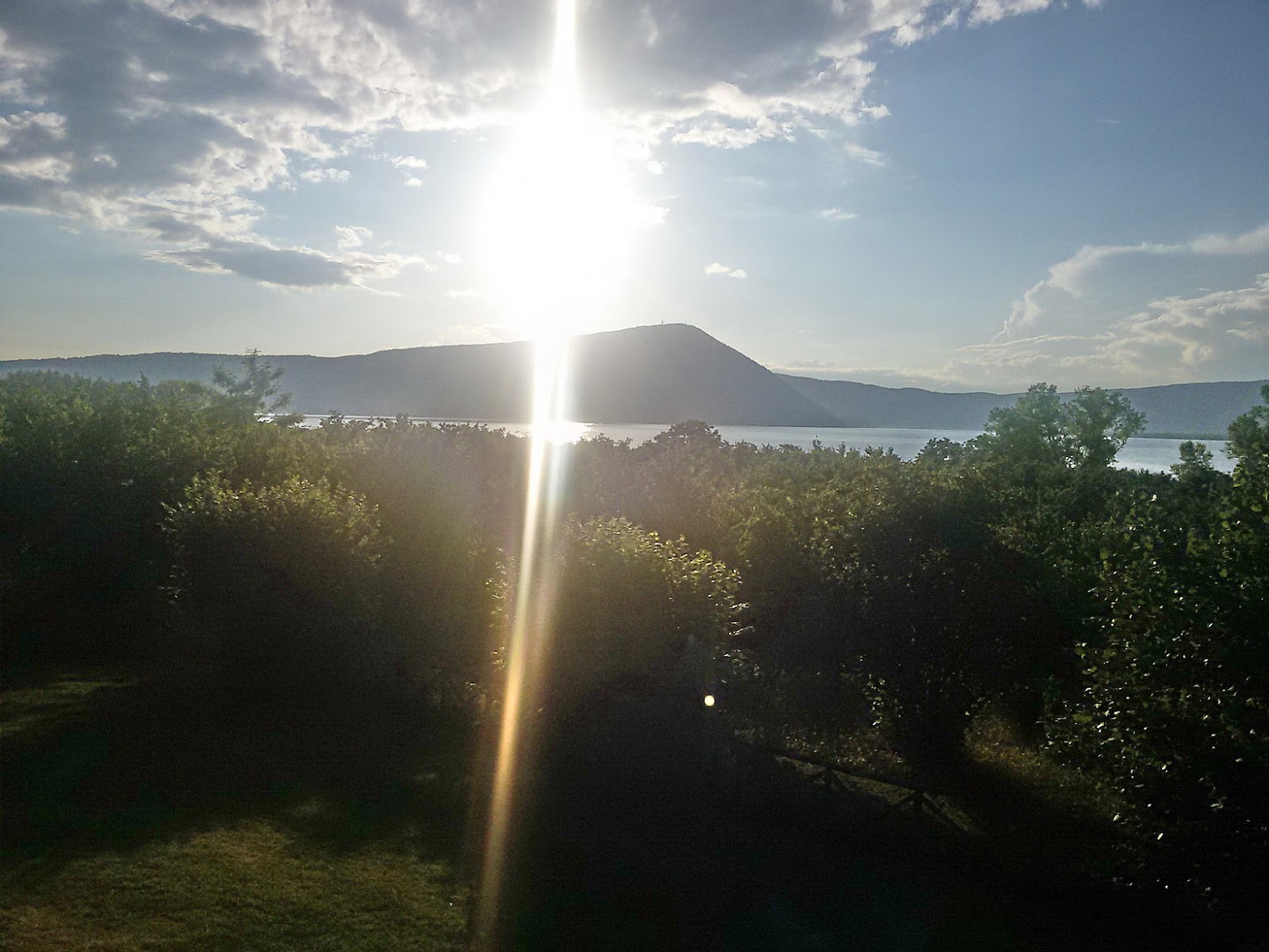 Con le moto percorriamo il sentiero che, tra i noccioli, porta alla struttura. C'è comodamente spazio per lasciare le 3 Triumph sotto un pergolato (questo lo dico a beneficio di chi gira in moto e volesse sapere se c'è modo di tenerla al riparo). Dopo aver salutato Lucia, che ci accoglie mentre sta preparando la cena, Arturo e i suoi due simpatici cagnoloni ci fanno strada verso un sentiero che digrada verso la sponda del lago. Siamo immersi nel silenzio della natura e nella luce del tramonto e ascoltiamo i racconti di Arturo.