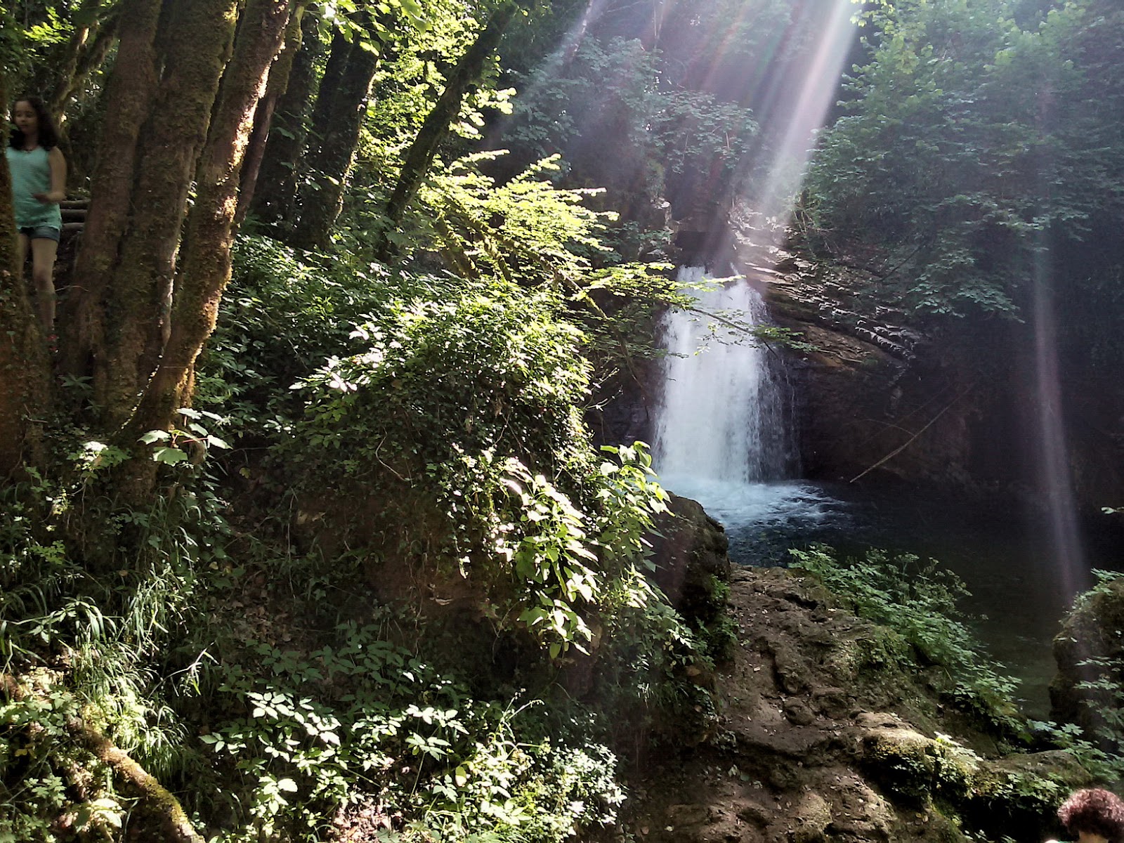 La cascata si raggiunge dopo una camminata a piedi nel bosco, una decina di minuti a occhio e croce. Il luogo svela pian piano la cascata, in una radura illuminata da fasci di raggi solari.
