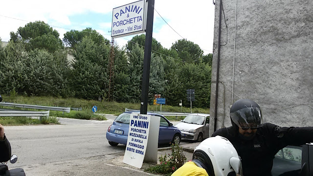 Giunti alla punta meridionale del lago proseguiamo prima lungo la SP34 e poi verso Collalto Sabiono e Ponte Cinolfo. Ci reimmettiamo sulla SP34 nei pressi del Ristorante Casabianca, sulla Turanense, qualche km prima di Carsoli. Dal momento che siamo affamati, decidiamo di fermarci per un boccone: la scritta "Porchetta" è invitante.