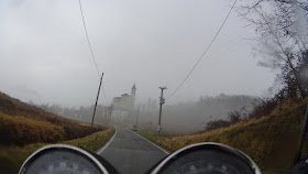 Dopo un po' il bosco attraverso il quale si snoda la stretta strada finisce e si apre un piccolo pianoro.. sullo sfondo, quasi a sorgere dalla nebbia, una chiesa...